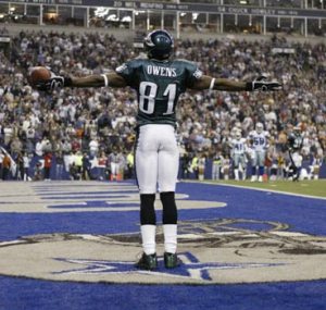 (*)I was “in college” at the time – meaning I sat in my apartment all day, not going to class, getting stoned, watching movies and furiously following every move the Eagles made. I’ll never forget turning to my roommate after the whole Eagles-TO acquisition finally played out and (honest to God) saying “this isn’t going to end well.” I think it was due to the fact that McNabb and Owens instantly became best friends in an odd, forced way. Watching the two of them playfully joke around during interviews on ESPN almost felt like watching a Hollywood sham-marriage – where two stars are “set-up” by publicists to further an agenda (ie. Tom Cruise not being gay).